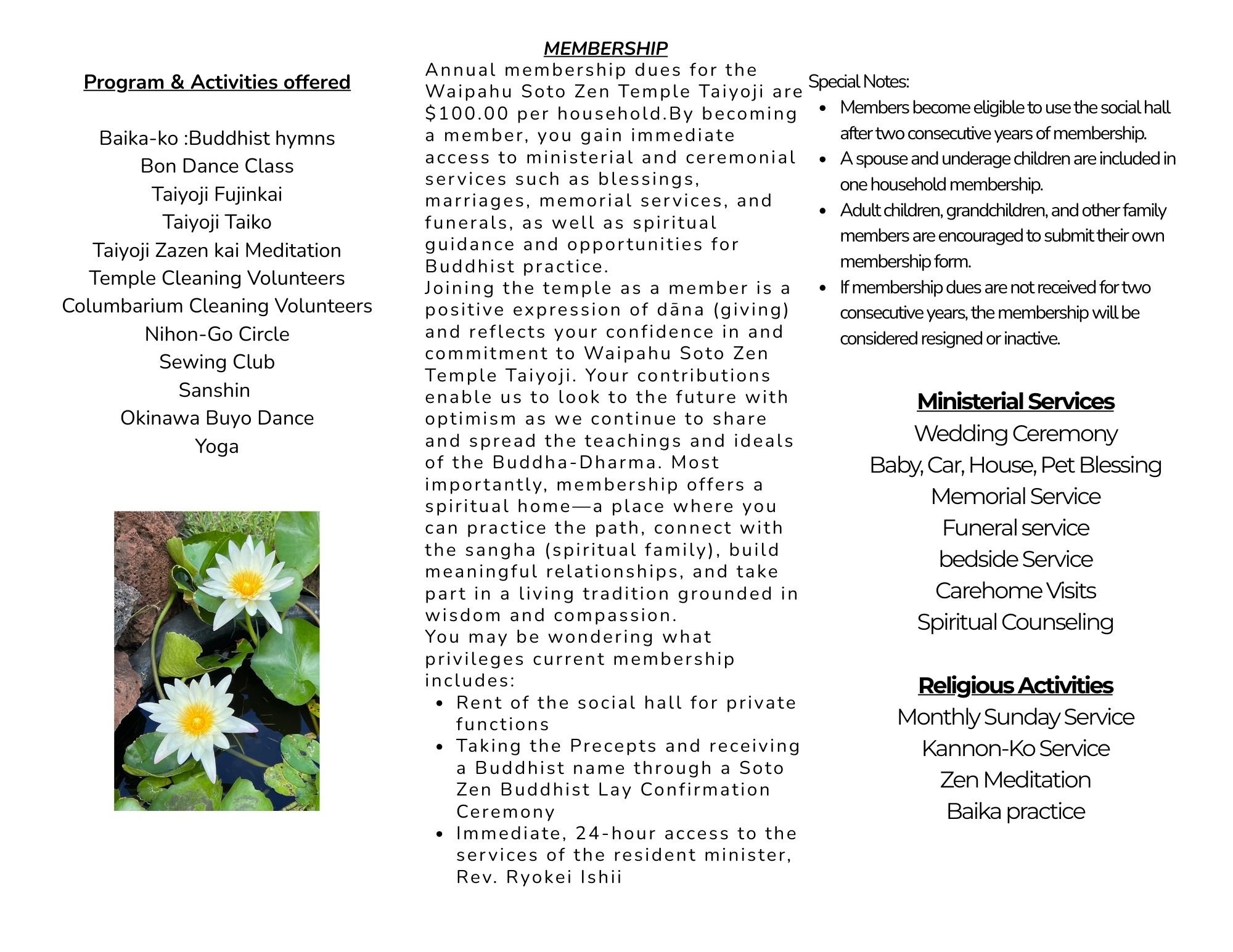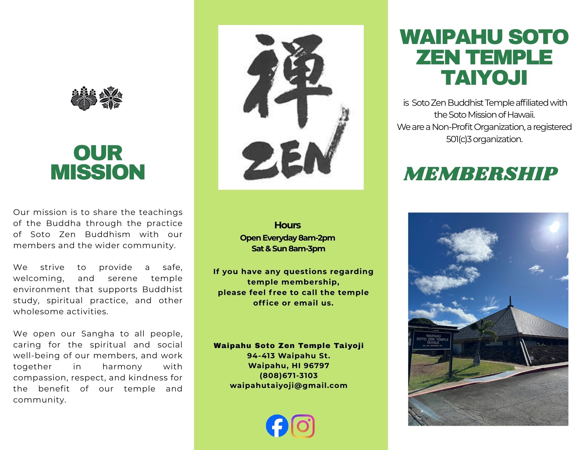 Soto Zen Buddhist Temple is affiliated with the Soto Mission of Hawaii